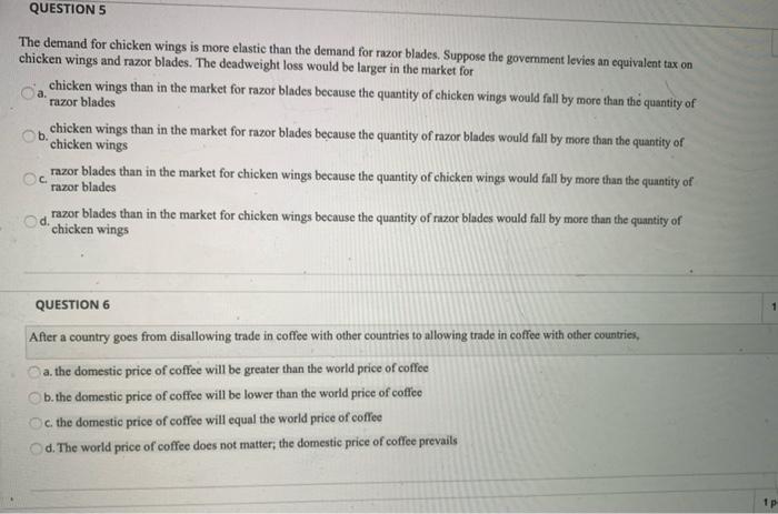 Question 1 The demand for chicken wings is more elastic than the demand for razor blades. Suppose the government levies an equivalent tax on chicken wings and razor blades. The demand for chicken wings is more elastic than the demand for razor blades.